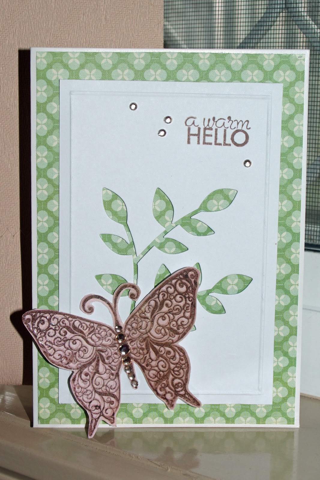P.S. The cutting die I used was Lorelai Leaf from Poppy Stamps. The butterfly stamp was from Kaisercraft's Flora and Fauna stamp set and the green patterned paper was from a free paper pad from We R Memory Keepers. The sentiment was from HOTP Labels and Frames stamp set. Enjoy.